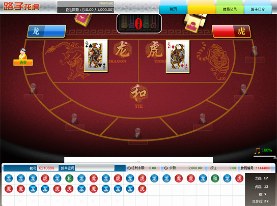 玩家可投注于龙,虎,和。系统将派三张牌,第一牌不开然后每门各派一只牌,即龙与虎,双方斗大。本公司所开"龙"或"虎"将不抽取任何佣金,但如开"和",而玩家下注"龙"或"虎",玩家将输一半下注金额。